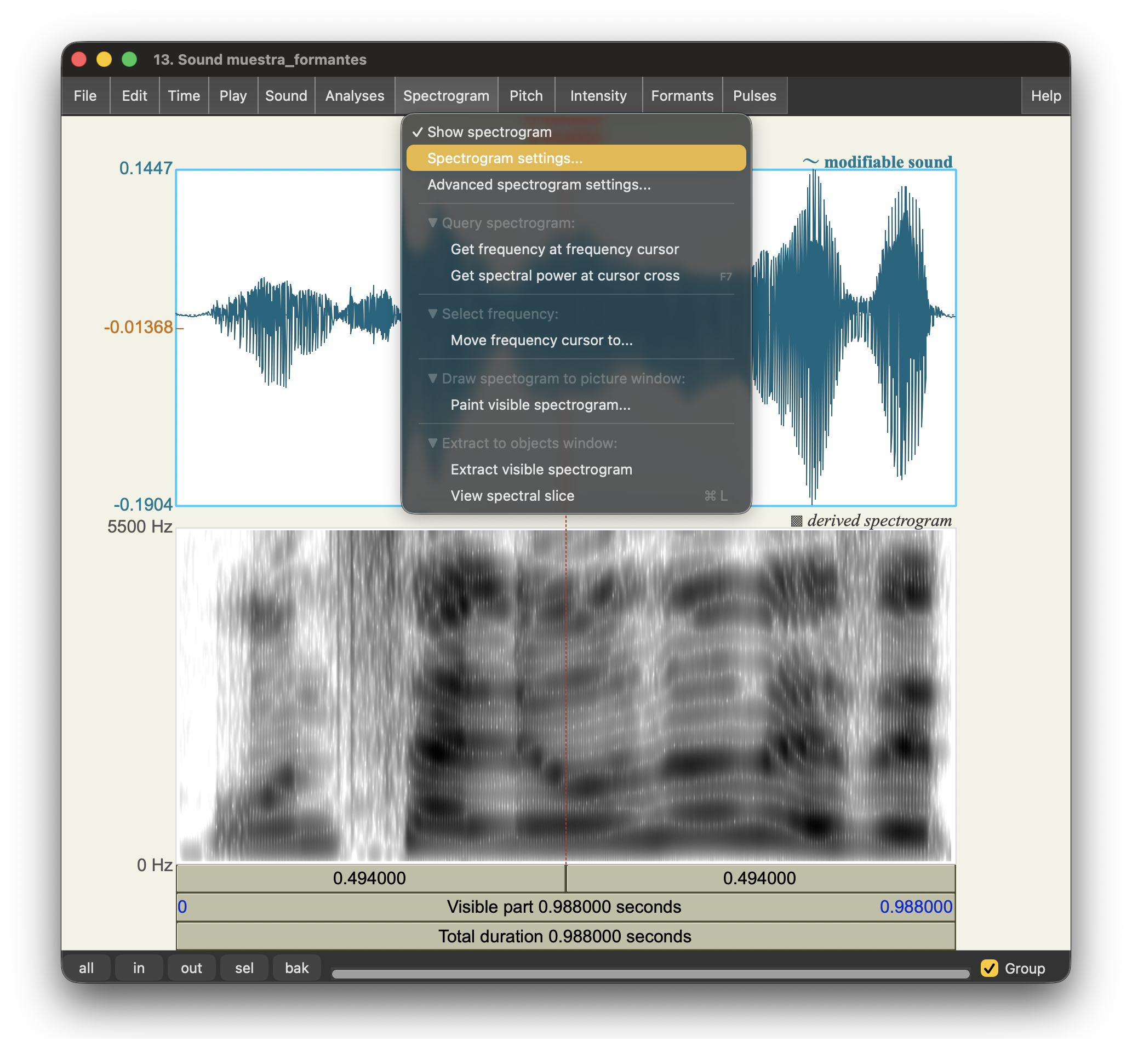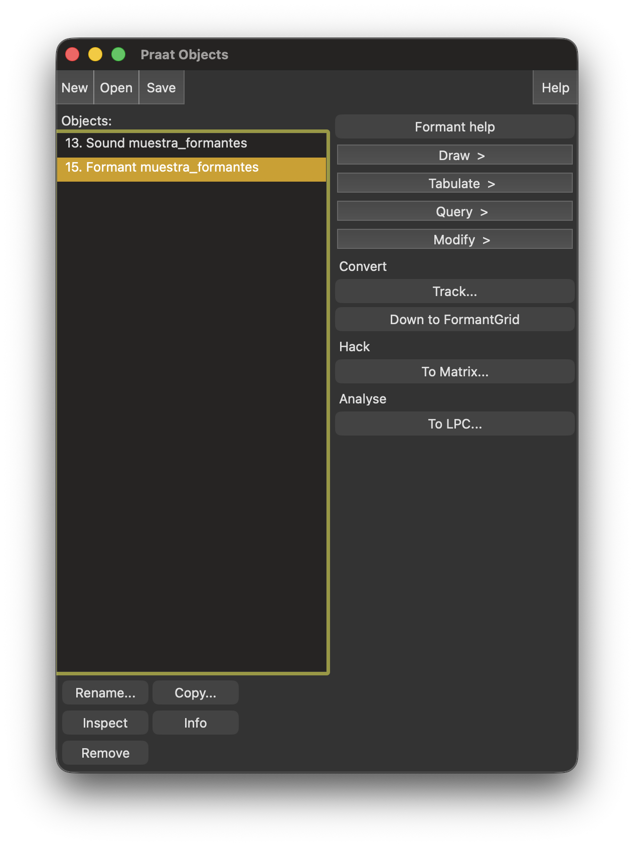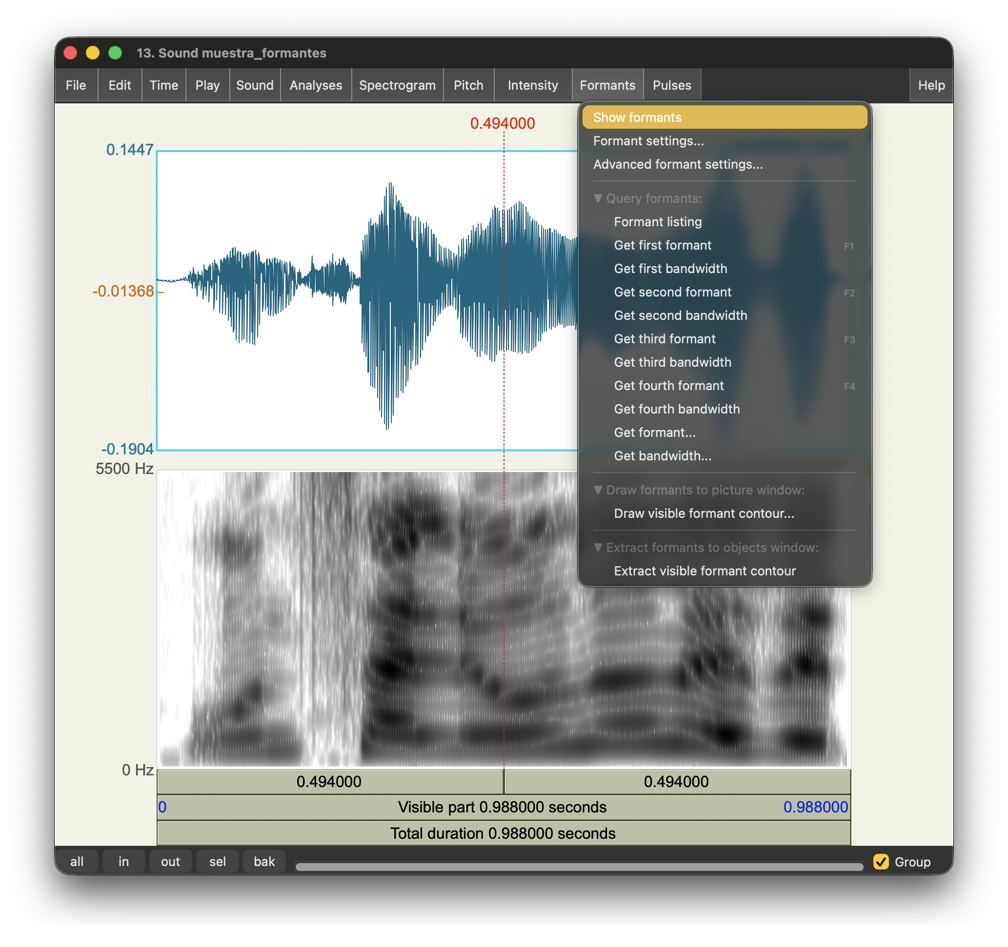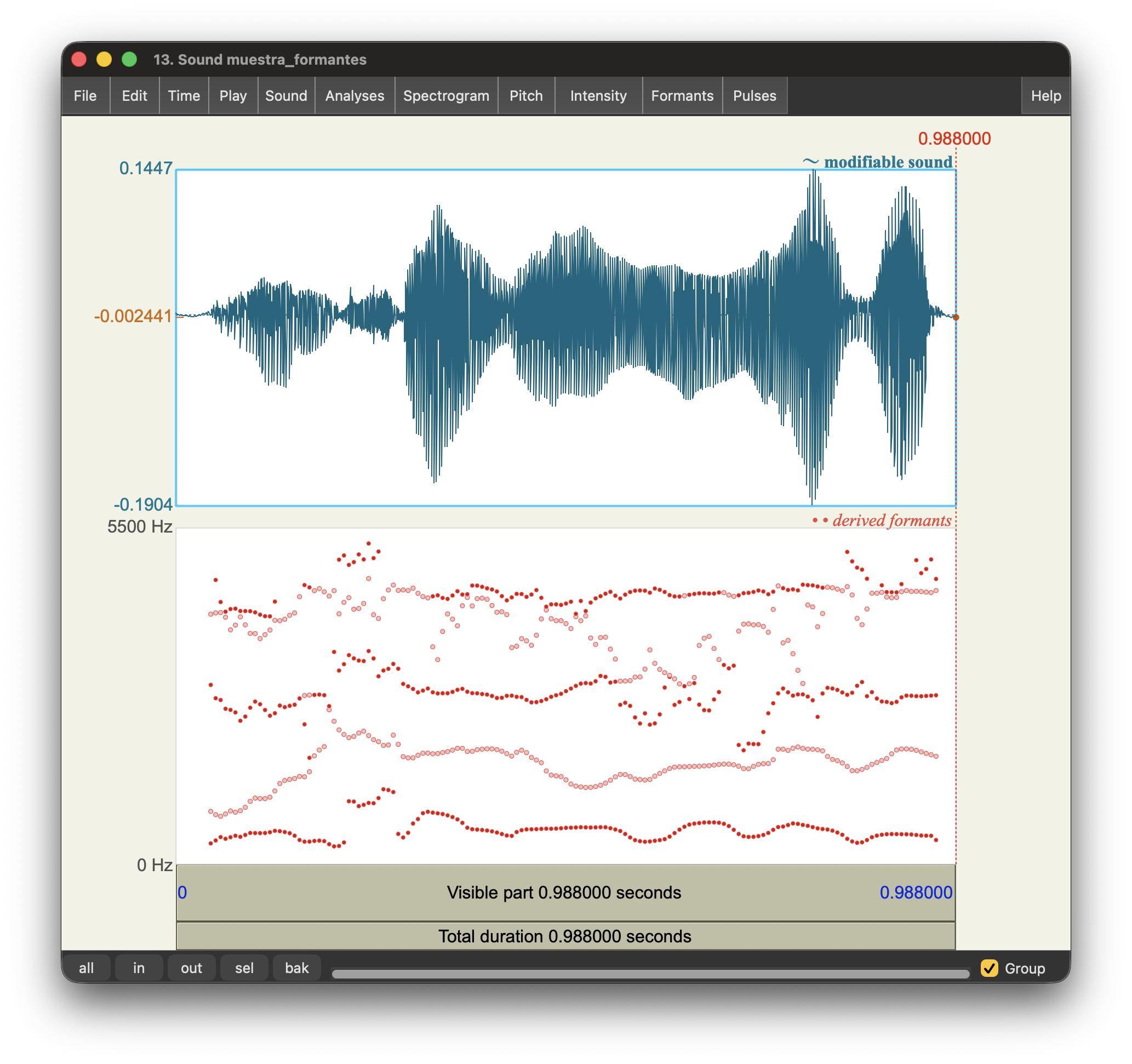 Sección titulada «5. Formantes»Para analizar los formantes se debe crear el objeto Formant con los parámetros ajustados según se trate de voz femenina, masculina o infantil. Siempre es conveniente ver los formantes en la ventana de edición.