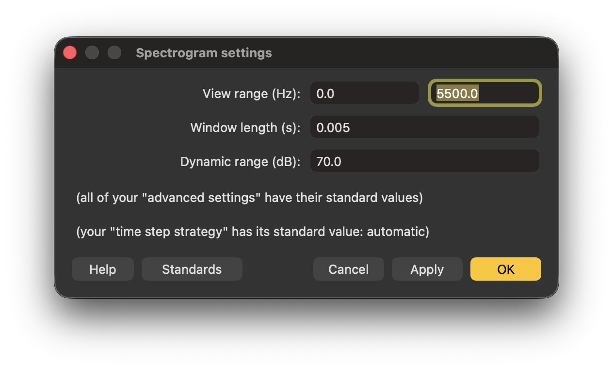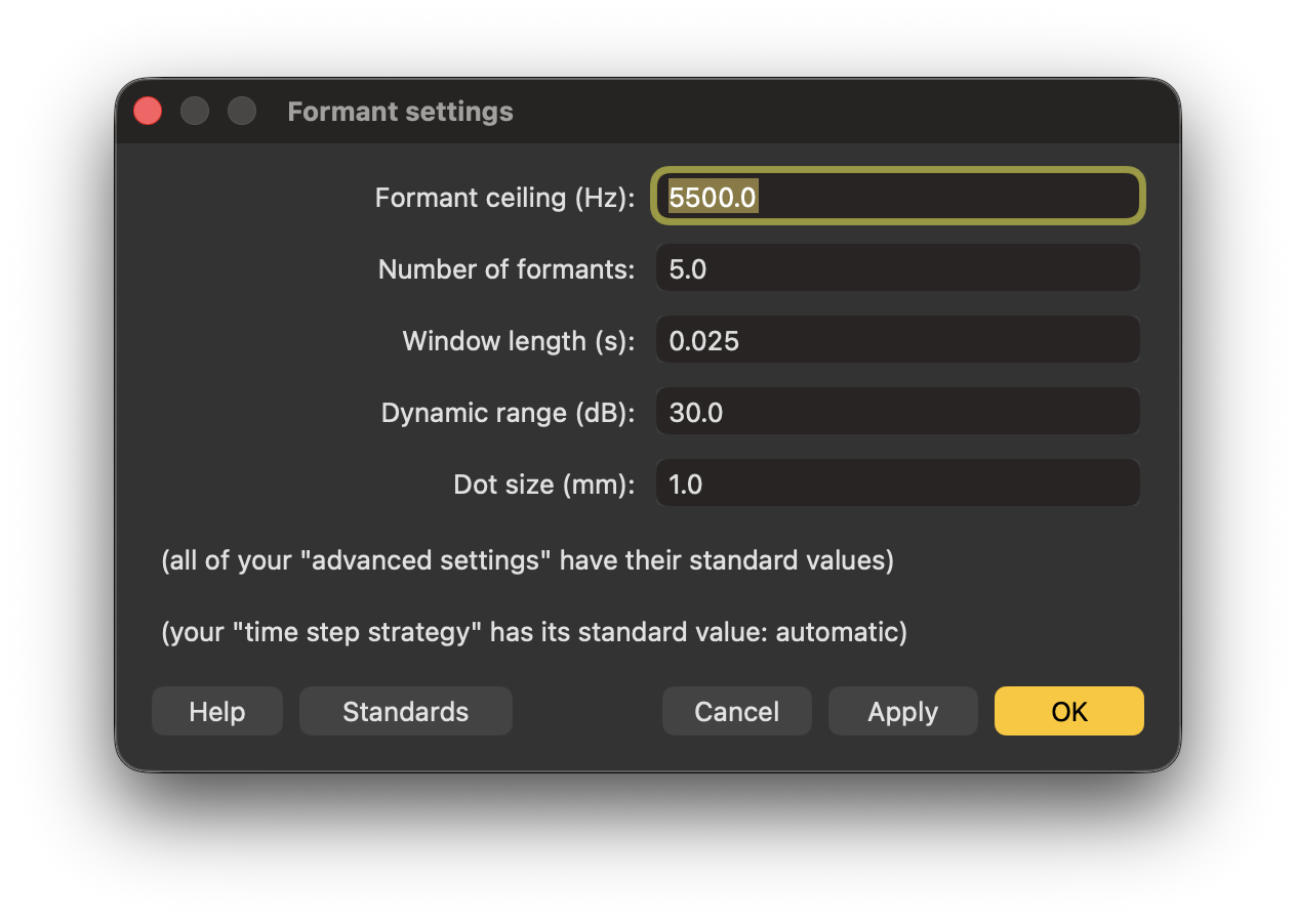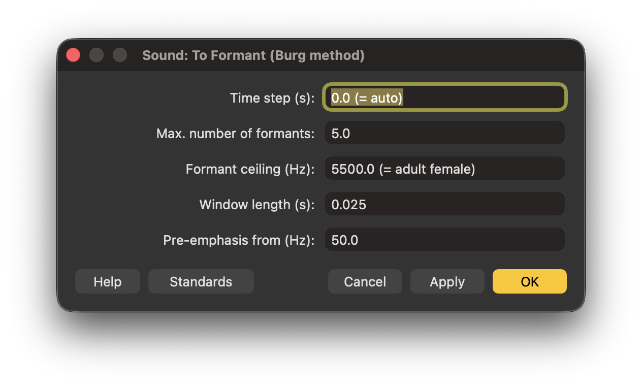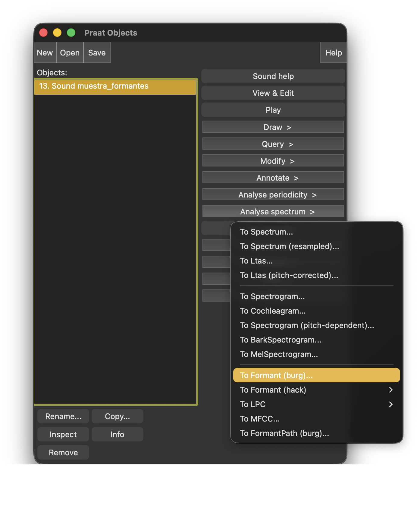 Sección titulada «5. Formantes»Para analizar los formantes se debe crear el objeto Formant con los parámetros ajustados según se trate de voz femenina, masculina o infantil. Siempre es conveniente ver los formantes en la ventana de edición.